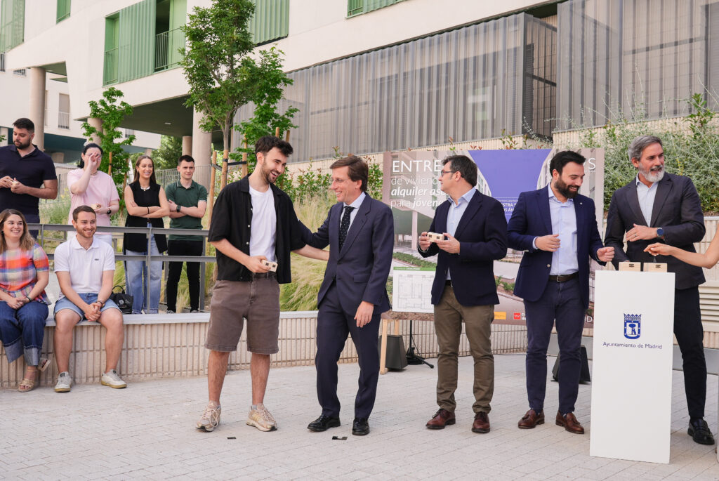 El 89 % de las viviendas sorteadas de nueva construcción de la Empresa Municipal de la Vivienda y Suelo de Madrid (EMVS Madrid) han sido adjudicadas a personas de hasta 35 años y a familias con menores. Así lo ha destacado el alcalde de Madrid, José Luis Martínez-Almeida, tras entregar a una treintena de jóvenes madrileños las llaves de sus nuevas viviendas públicas de alquiler asequible que la EMVS Madrid ha promovido en el ecobarrio de Puente de Vallecas.