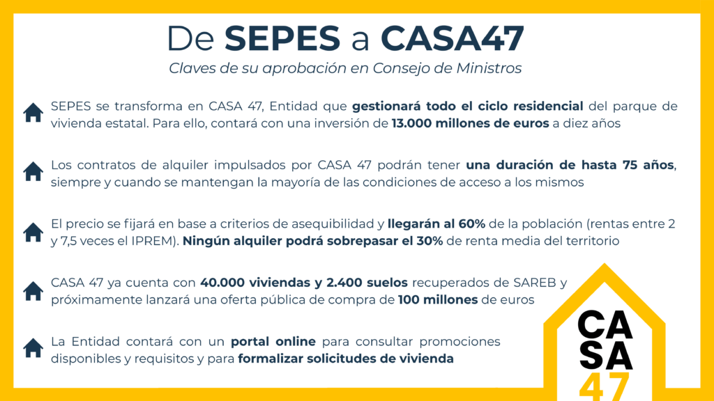 El Consejo de Ministros ha aprobado un Real Decreto que modifica el estatuto de SEPES Entidad Estatal del Suelo para transformar su nombre y adaptar su organización a la nueva realidad de CASA 47. Los contratos de CASA 47 podrán tener una duración de hasta 75 años siempre y cuando se mantengan la mayoría de las condiciones de acceso y el precio de los alquileres se fijará en base a criterios de asequibilidad, para que nunca supere el 30% de la renta media por hogar de la zona.