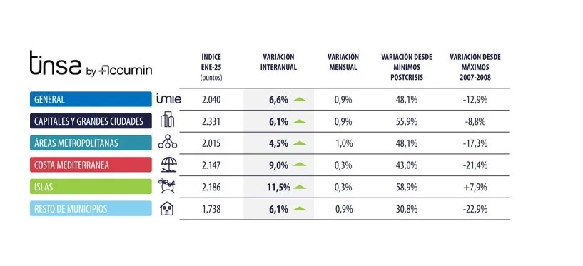 El precio de la vivienda prosiguió su senda ascendente en enero y es un 6,6 % más cara que en el mismo mes de 2023 (+3,6 % en términos reales, descontando el efecto de la inflación). Las grandes ciudades (+0,9 % mensual) y áreas metropolitanas (+1,0 %) fueron los grupos más dinámicos y situaron en un 0,9% mensual el crecimiento del precio medio en España en enero.