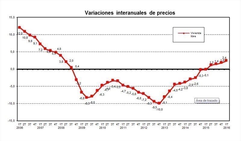 El precio medio del m2 de la vivienda libre en España se ha situado en 1.492,4 euros en el primer trimestre de 2016, lo que supone una variación trimestral del 0,2% e interanual del 2,4%.