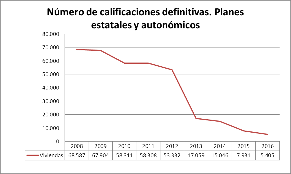 La promoción de VPO en España sigue en caída libre. De las 68.587 calificaciones definitivas de vivienda protegida tanto en planes estatales como en autonómicos se pasó a 7.931 en 2015 y 5.405 en los primeros nueve meses de 2016. La Revista de la Vivienda Protegida recoge mediante cuadros la evolución de la promoción de VPO por comunidad autónoma.