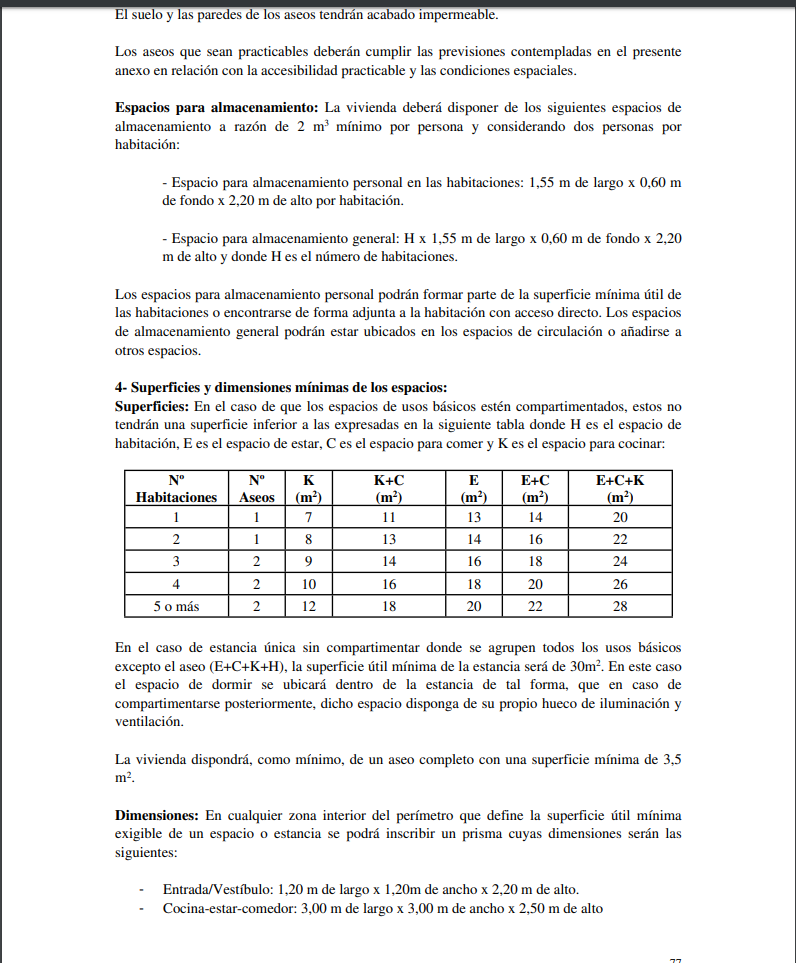 El Gobierno Vasco tiene ya redactado un decreto, que entrará en vigor el año próximo, y que define cómo tienen que ser las viviendas, tanto nuevas como antiguas y tanto públicas como privadas. Las nuevas viviendas deberán tener, al menos, 35 metros cuadrados útiles y en las ya existentes no se podrá otorgar célula de habitabilidad si no disponen de 25 m2 si sólo vive una persona y a medida que aumentan los habitantes la superficie debe también ser mayor. El decreto es exhaustivo a la hora de definir los equipamientos. Hasta el punto de que obliga a que el edificio disponga de felpudo en el portal o de un local para aparcar los coches de niño, con una plaza por cada 10 vecinos, entre otros muchos equipamientos. Recogemos el proyecto de decreto en su integridad.